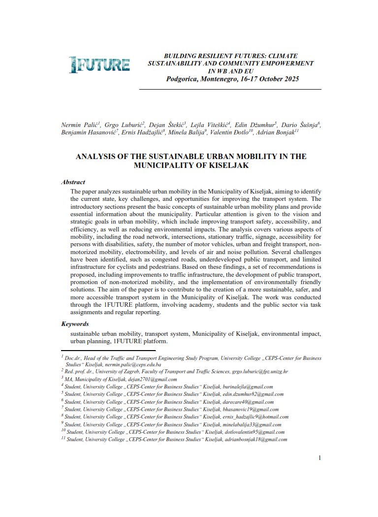 Inicijativa Općine Kiseljak, koja je pokrenuta kao neformalna i pilot-suradnja s akademskom zajednicom, uspješno je privedena kraju uz aktivno sudjelovanje studenata i profesora Visoke škole CEPS. Cilj aktivnosti bio je analizirati stanje urbane mobilnosti u Kiseljaku, kroz terensko istraživanje, razmjenu ideja i promišljanje o mogućim rješenjima za unapređenje lokalnog transportnog sistema.