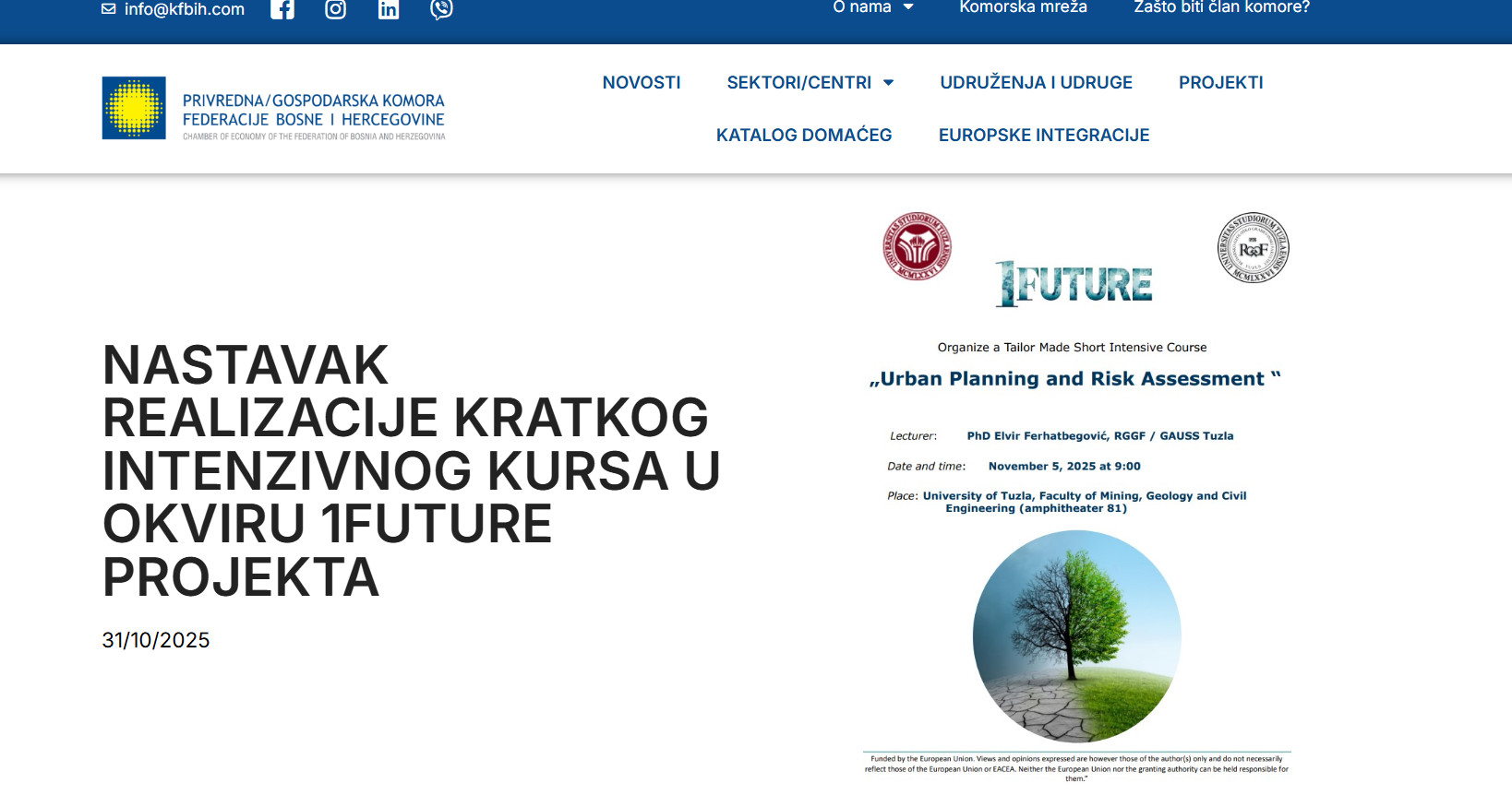Privredna komora Federacije Bosne i Hercegovine i Rudarsko-geološko-građevinski fakultet Univerziteta u Tuzli, u okviru Erasmus+ projekta 1FUTURE, pozivaju studente I i II ciklusa studija, nastavno osoblje, saradnike i profesionalce da se pridruže aktivnostima Kancelarije za klimatske promjene i održivost u realizaciji Kratkog intenzivnog kursa (TMSIC – Tailor Made Short Intensive Course) “Održiva energija, građevinarstvo i urbana otpornost”.